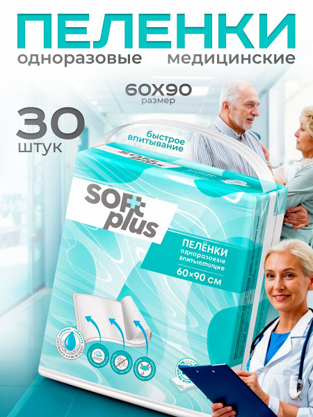 Пелёнки одноразовые 60х90 для взрослых, 30 штук, Soft Plus купить на