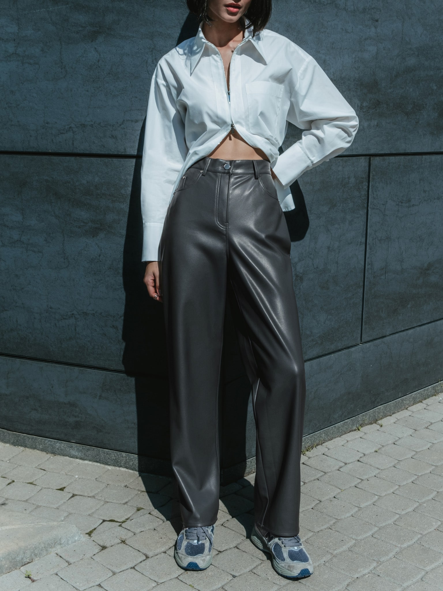 Прямые брюки из экокожи с молнией спереди :: LICHI